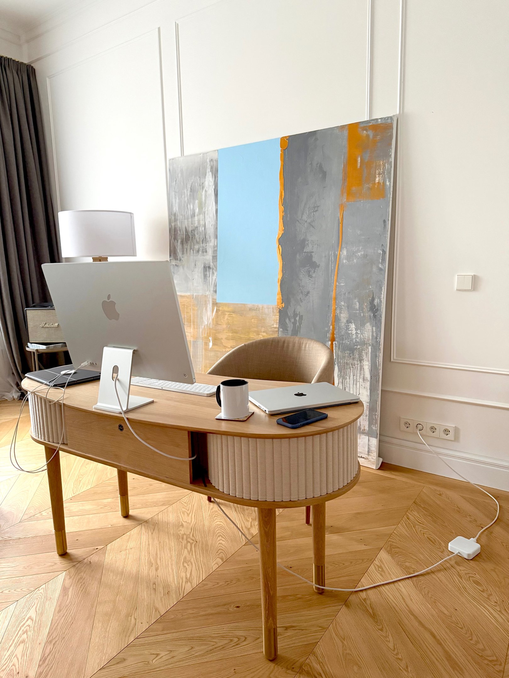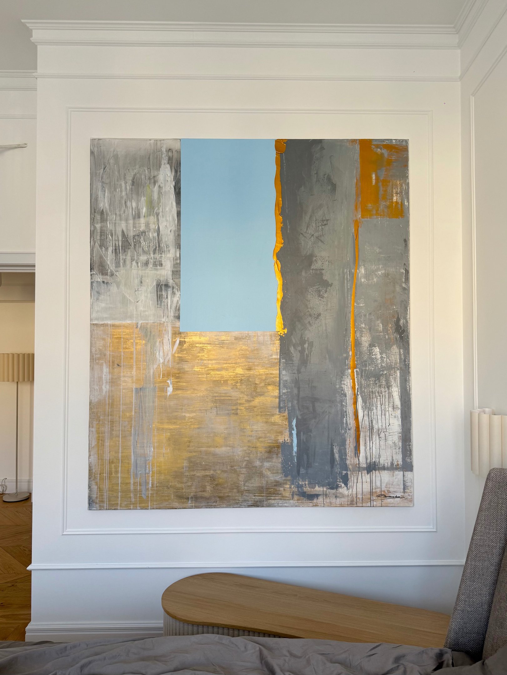 Šis kūrinys skleidžia elegantišką šilumą, kurioje susilieja modernizmo estetika ir subtilus praeities dvelksmas. Jame tvyro sodri ramybė, vibruojantis minimalizmas ir santūri prabanga. Šiuo metu paveikslas įkurdintas miegamajame, tačiau jo charakteris leidžia organiškai įsilieti į įvairias interjero erdves.