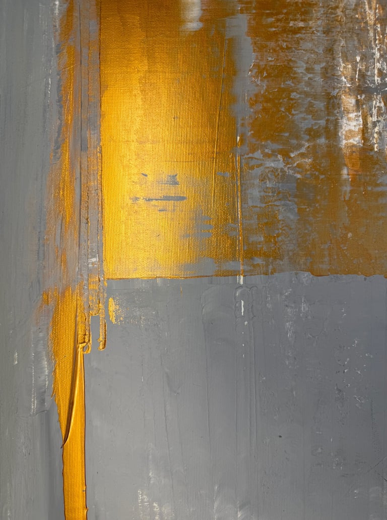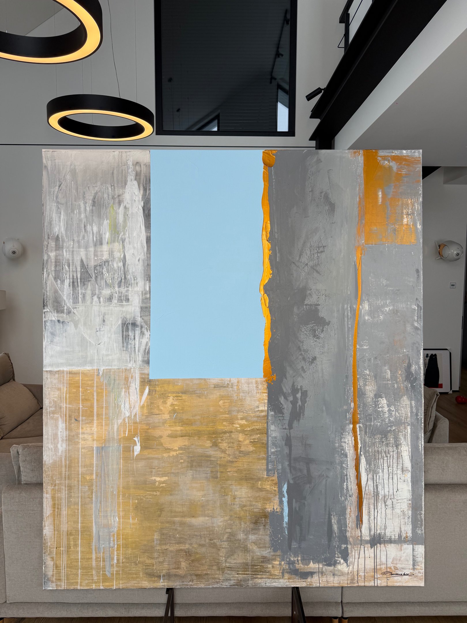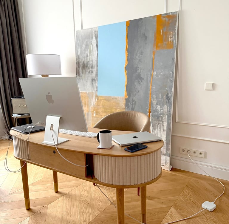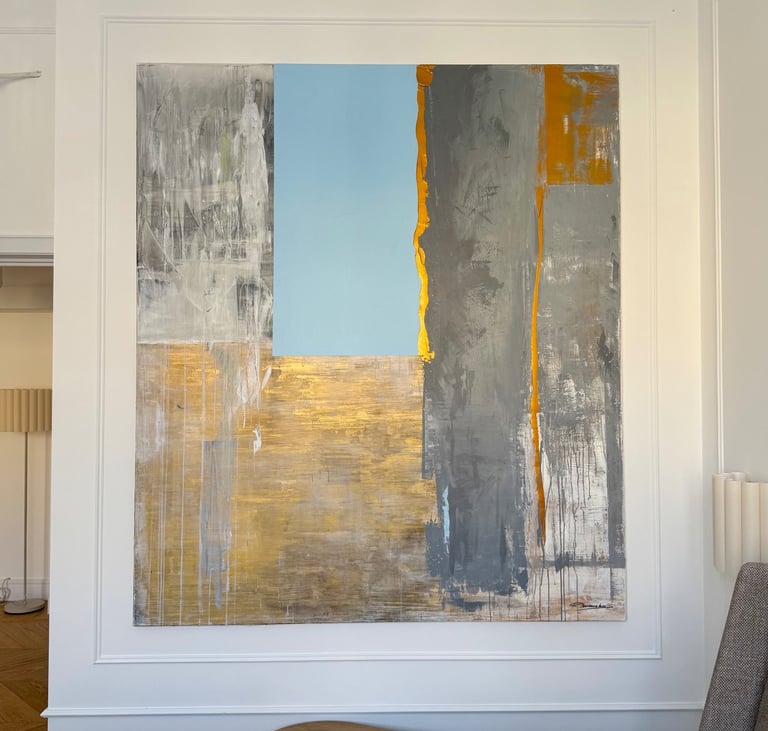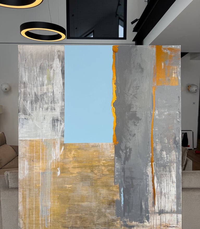 Start to dream! This work radiates an elegant warmth where the language of modernism meets a subtle echo of the past. A sense of deep calm permeates the composition, balanced by a vibrating minimalism and a restrained, quiet luxury. Currently placed in a bedroom setting, the painting possesses a presence that allows it to integrate naturally into a wide range of interior spaces.